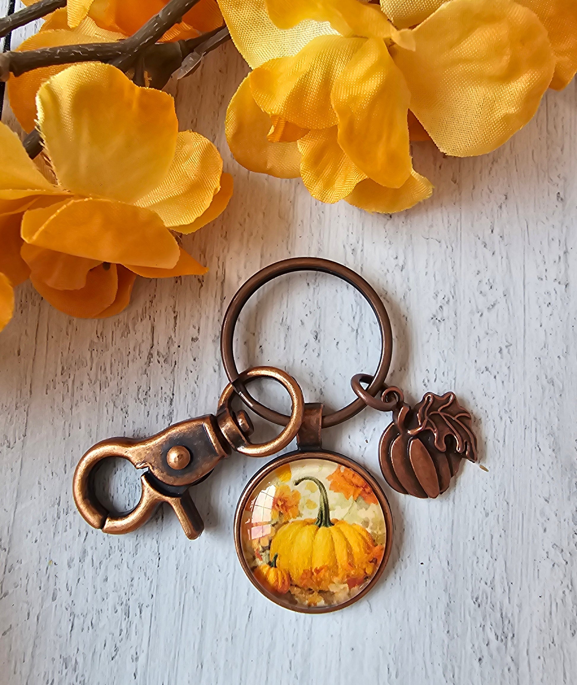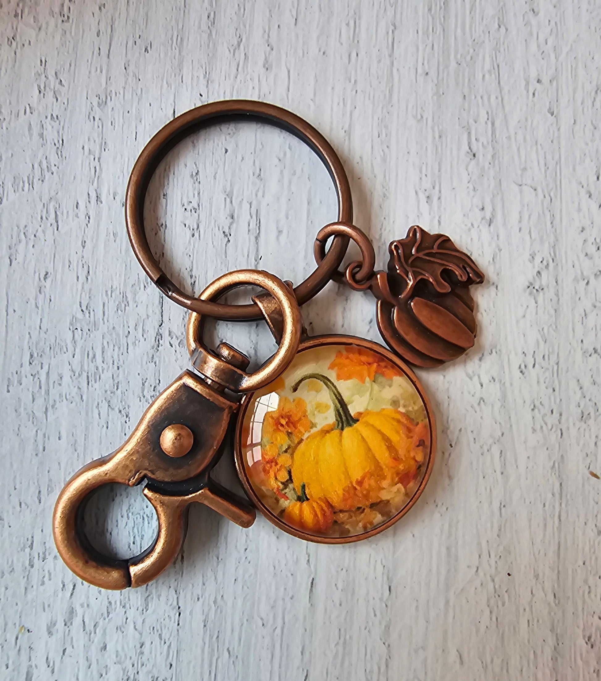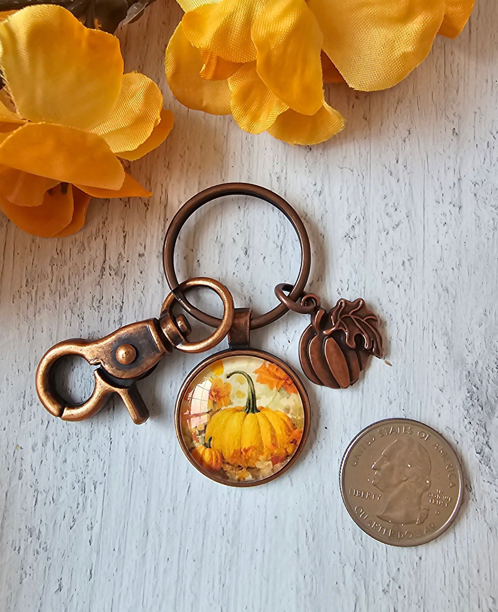This keychain features a glass picture pendant with a watercolor pumpkin in a copper plated base, and a copper plated pumpkin charm. The picture pendant is 1 inch. I've also included a sturdy copper plated matching clip for convenience as a bag/purse charm.