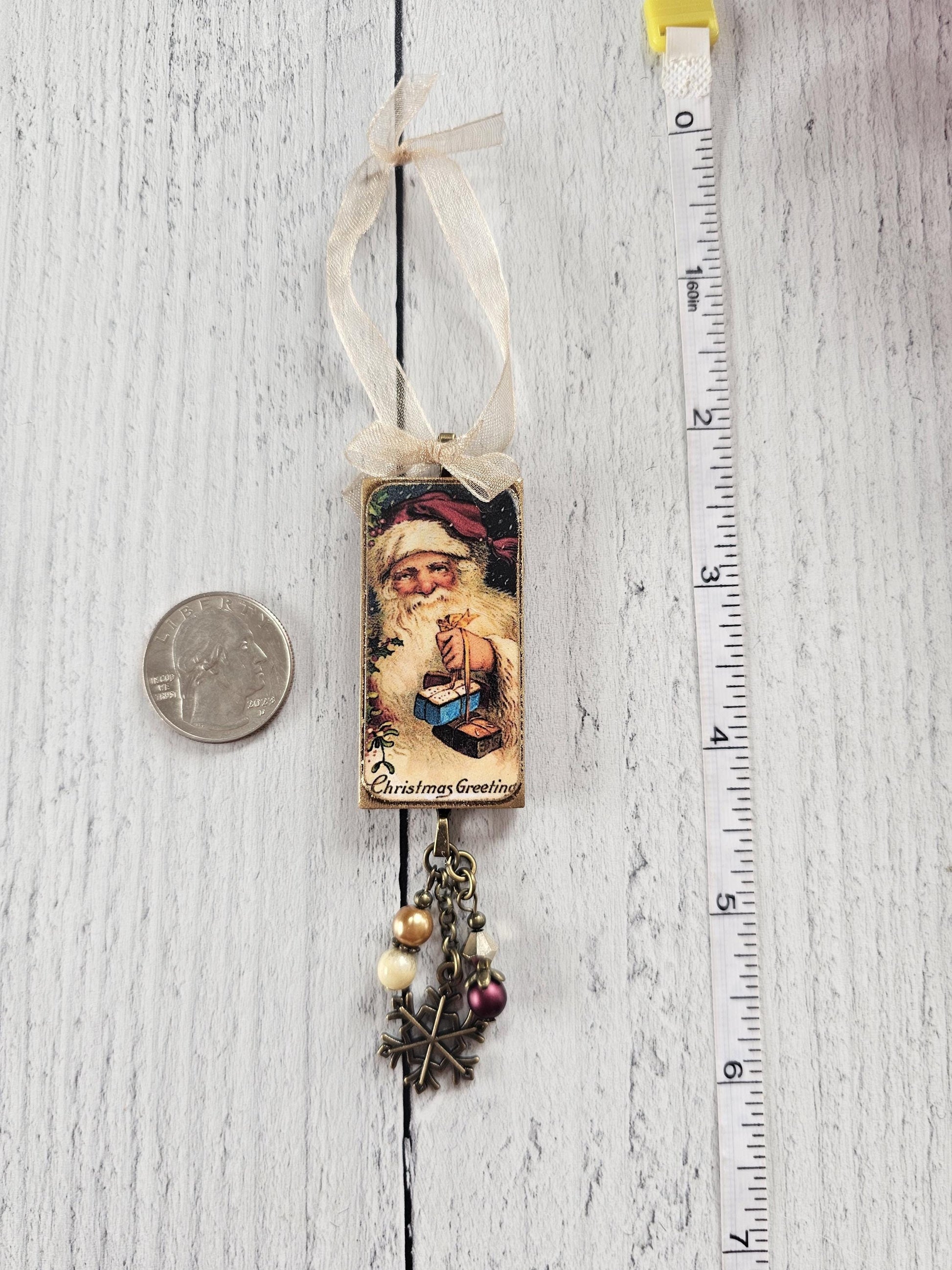 This handmade pendant features a reproduction of an old Christmas card picture of Santa. I've accented with glass bead dangle charms in gold and red, a snowflake charm and sheer gold ribbon. The ornament features a glossy finish. These make great gifts for the holiday season! Purchase one, or all three!
