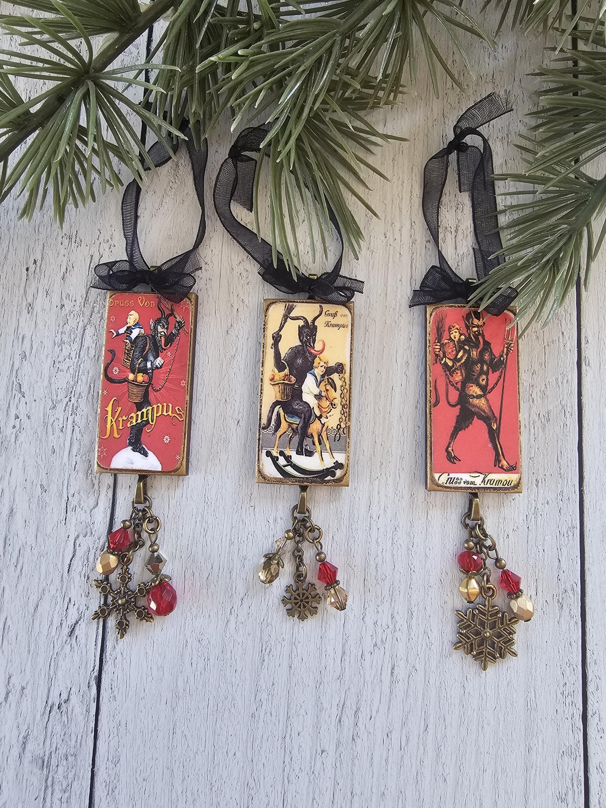 These handmade pendants feature vintage Krampus images. I've accented with glass bead dangle charms in gold and red, and sheer black ribbon. You can also choose a snowflake charm or jingle bell charm. The ornaments feature a glossy finish. These make great gifts for the holiday season! Purchase one, or all three!