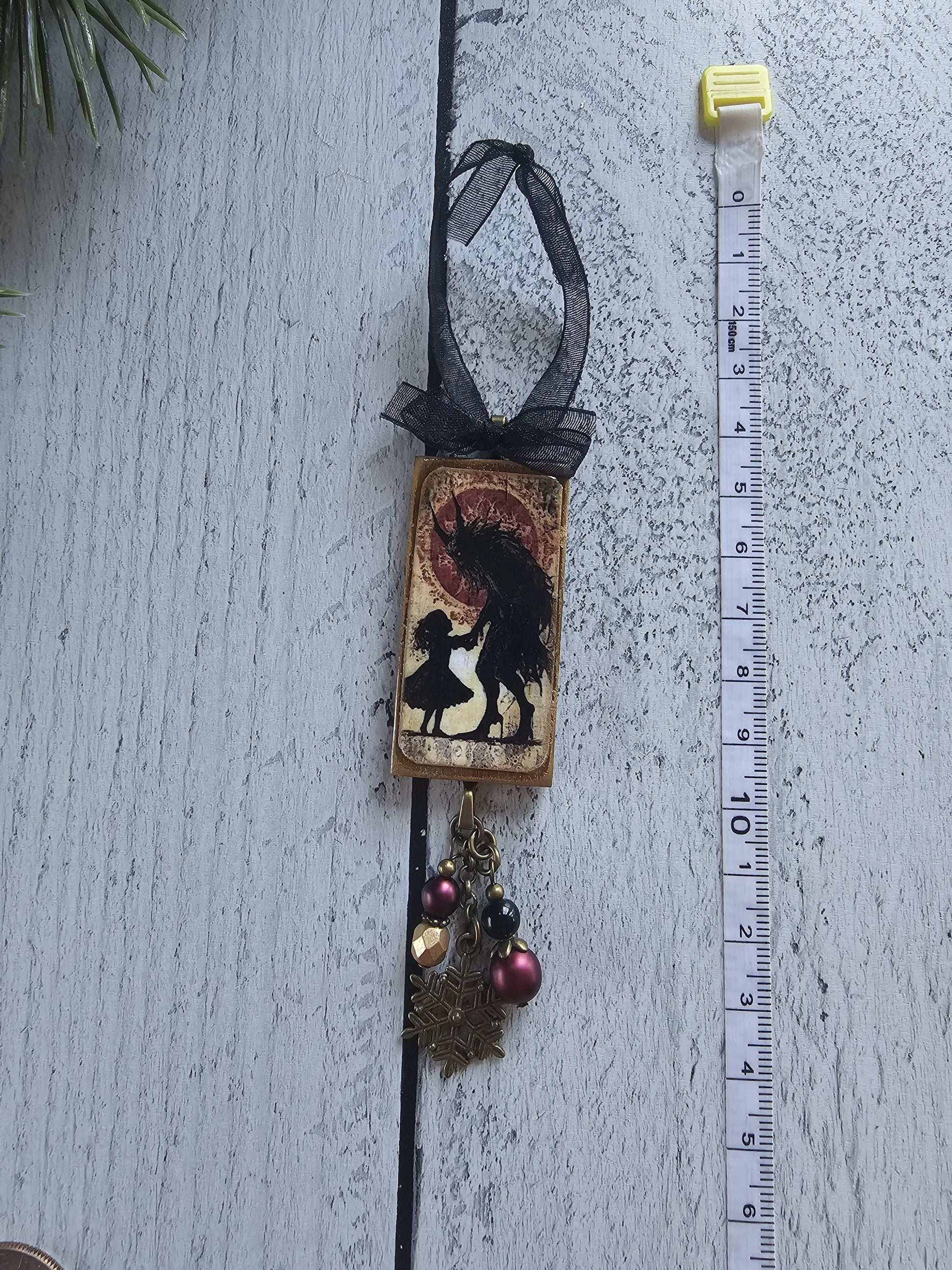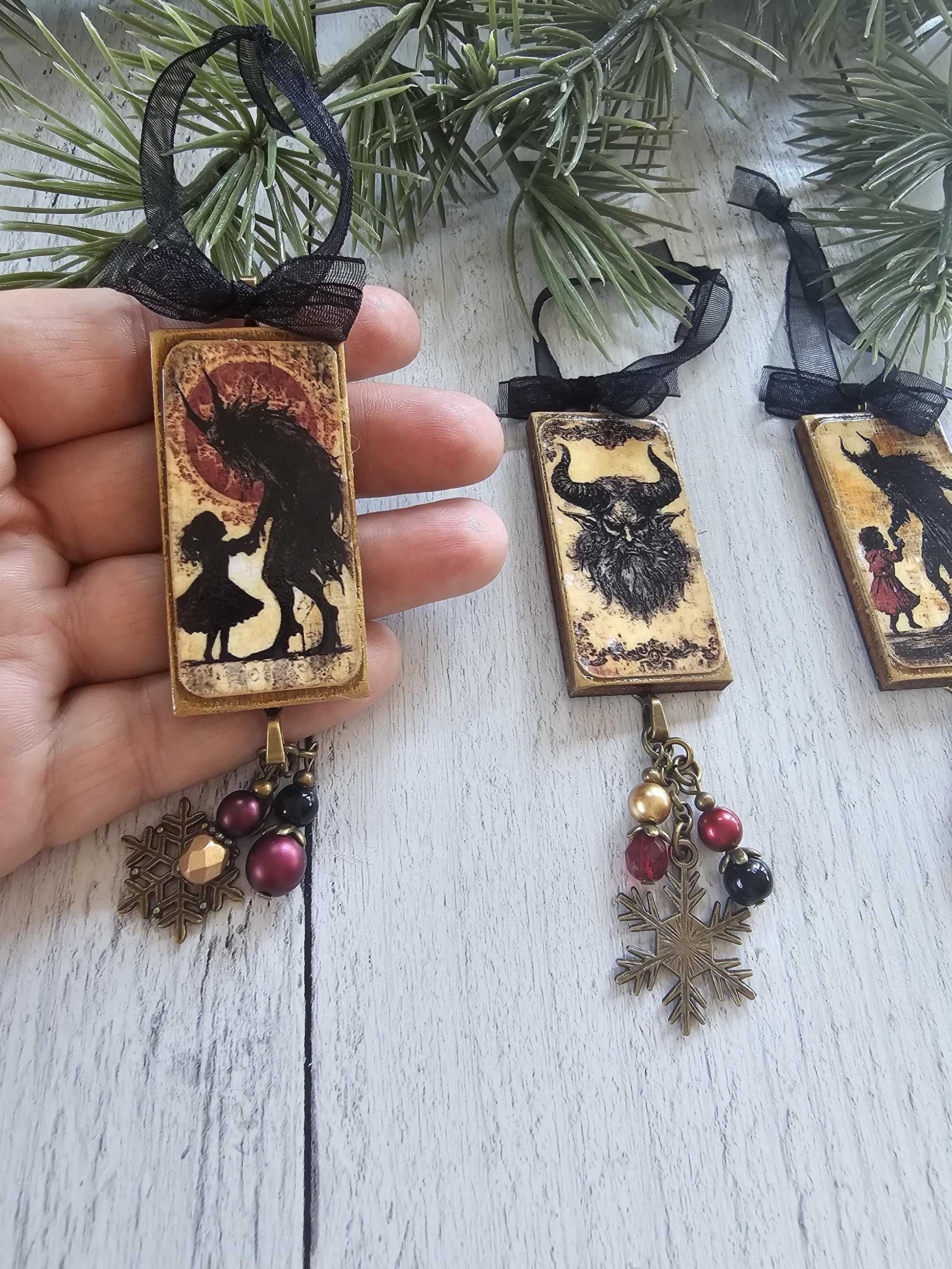 These handmade pendants feature creepy Krampus images. I've accented with glass bead dangle charms in gold, black and red, and sheer black ribbon. You can also choose a snowflake charm or jingle bell charm. The ornaments feature a glossy finish. These make great gifts for the holiday season! Purchase one, or all three!