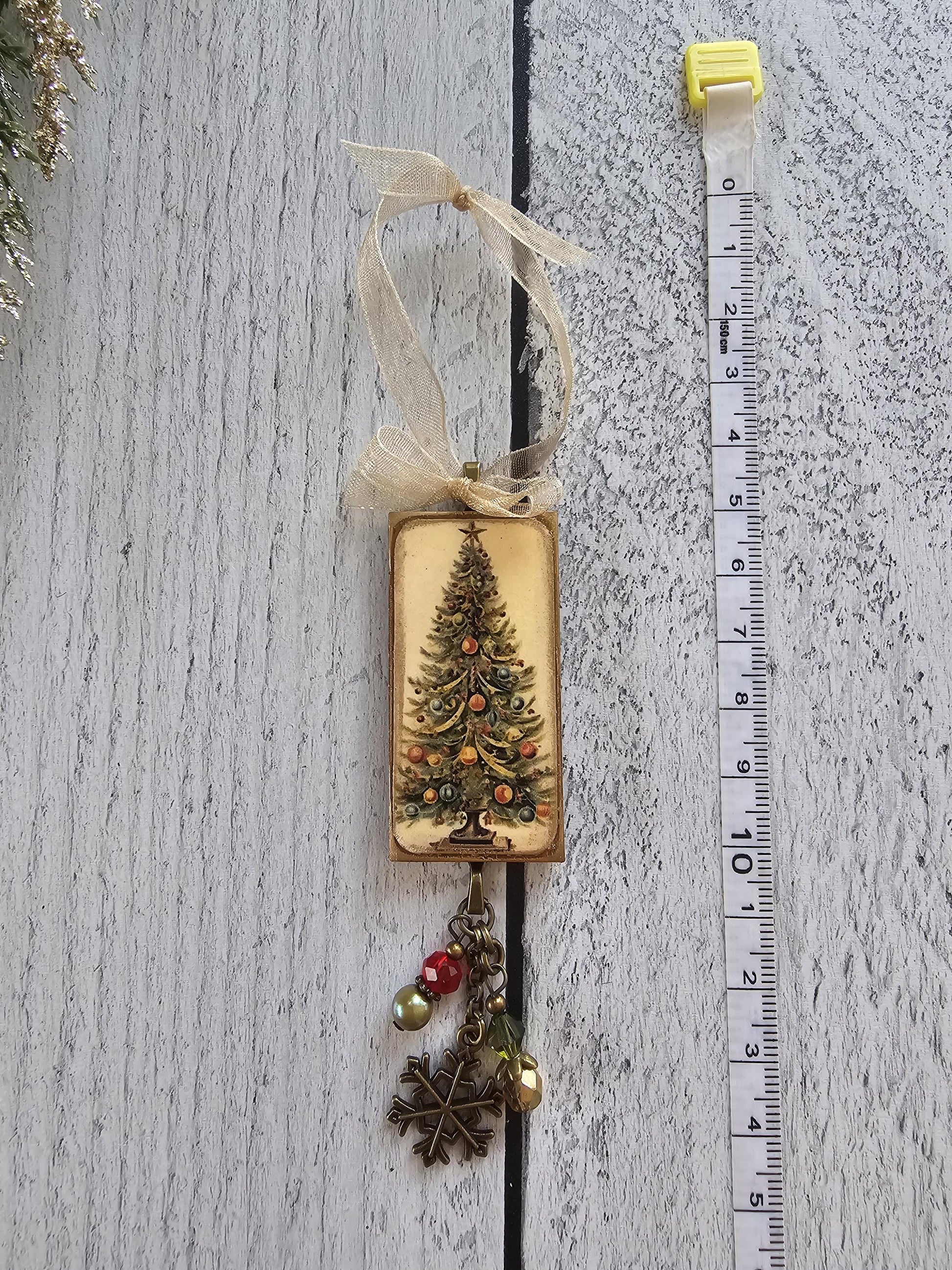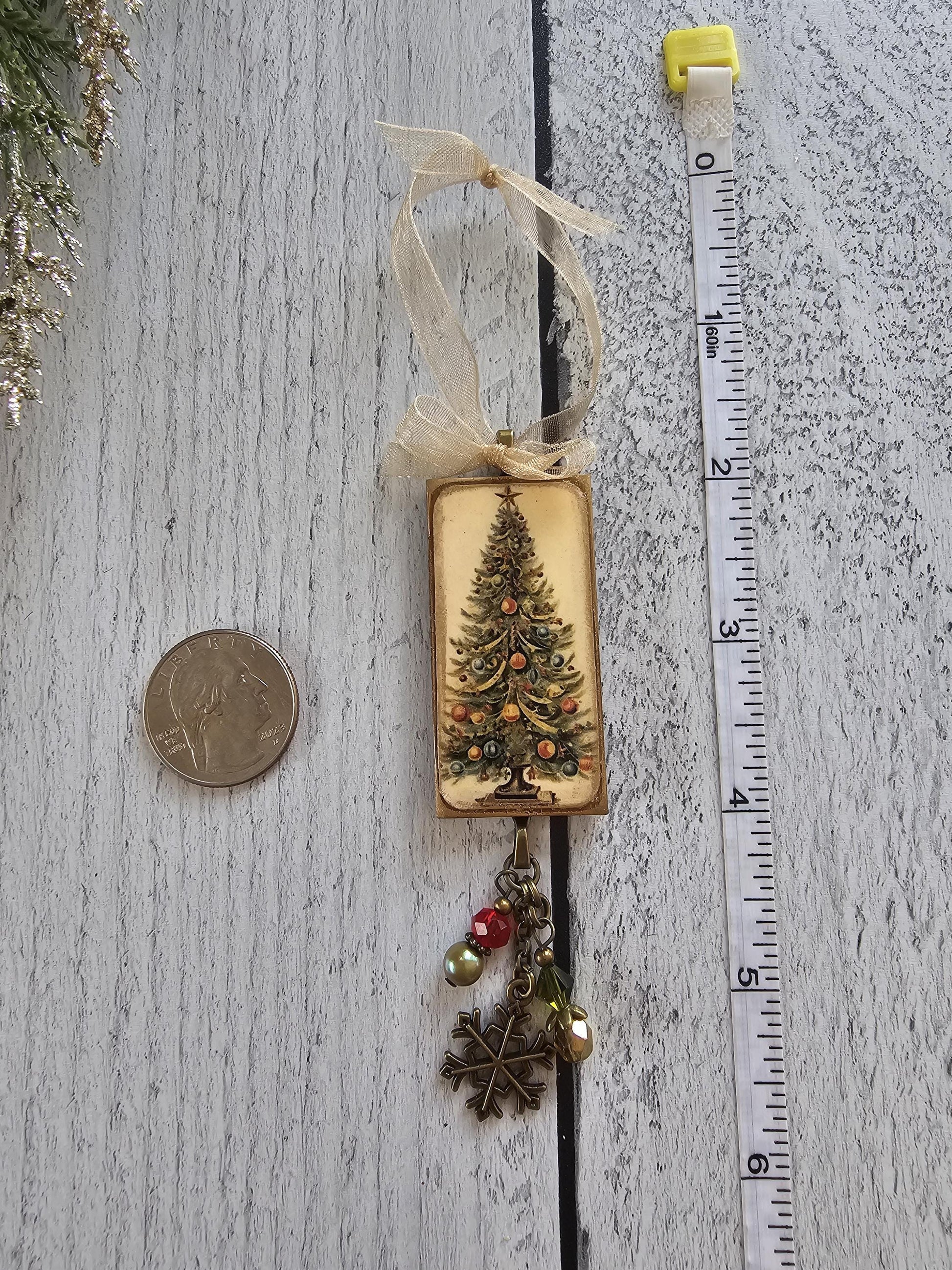 These handmade pendants feature Christmas trees done in a vintage style. I've accented with glass bead dangle charms in gold, red and green, snowflake charms and sheer gold ribbon. The ornaments feature a glossy finish. These make great gifts for the holiday season! Purchase one, or all three!