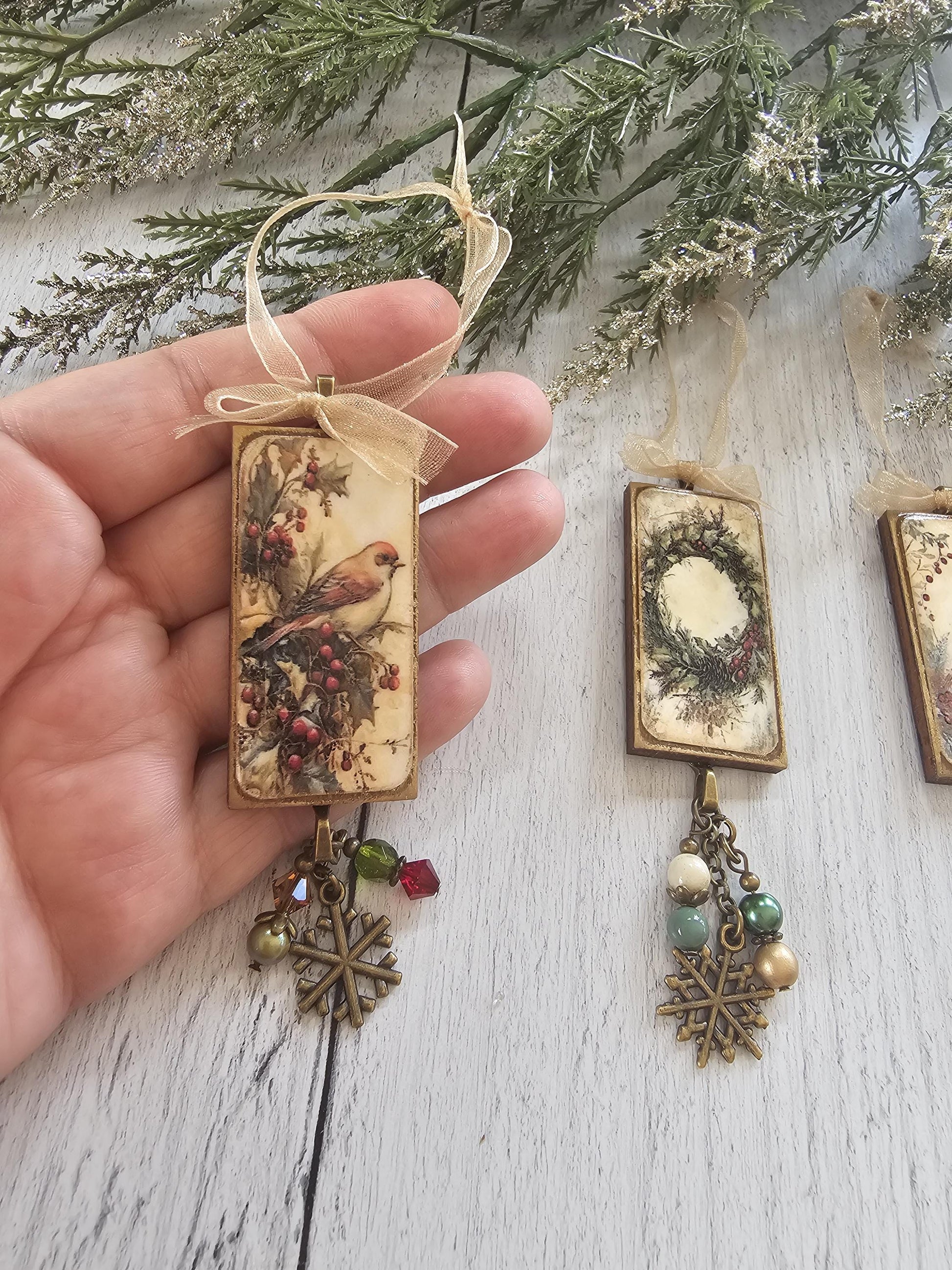 This listing features 3 unique rustic Yule or Christmas holiday ornaments that I've created from my printer, and wood pieces that are essentially domino size. They are picture pendants, with antiqued bronze plated accents. The pendants are glued, sanded, gilded, and sealed several times with two different processes, by me. They are light weight, lighter than my previous glass ornaments, but don't let that fool you. You can expect the same great quality you've come to expect with my products.