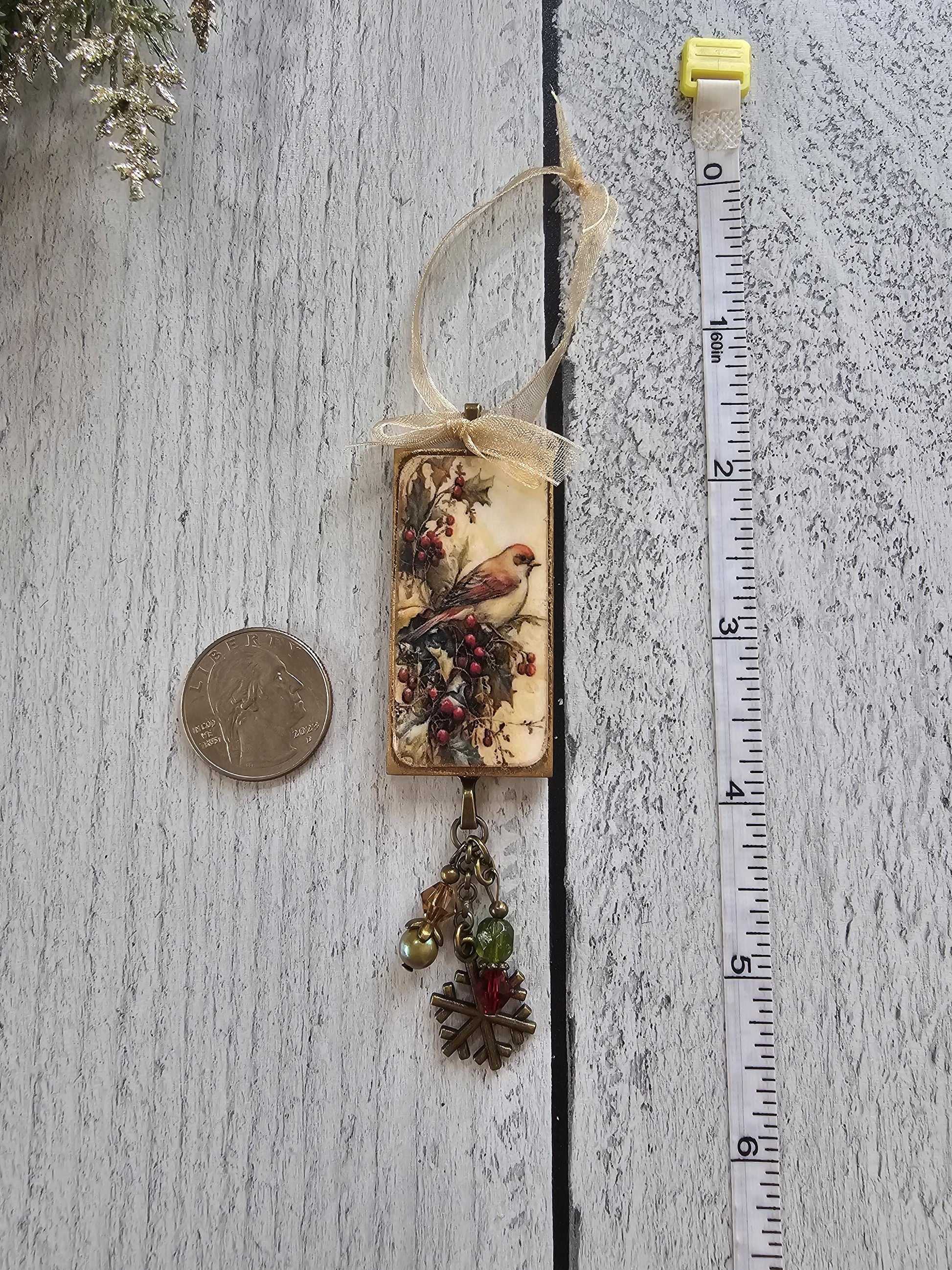 These handmade pendants feature yule or winter scenes with birds and a wreath. I've accented with glass bead dangle charms in gold, green and red, snowflake charms and sheer gold ribbon. The ornaments feature a glossy finish. These make great gifts for the holiday season! Purchase one, or all three!