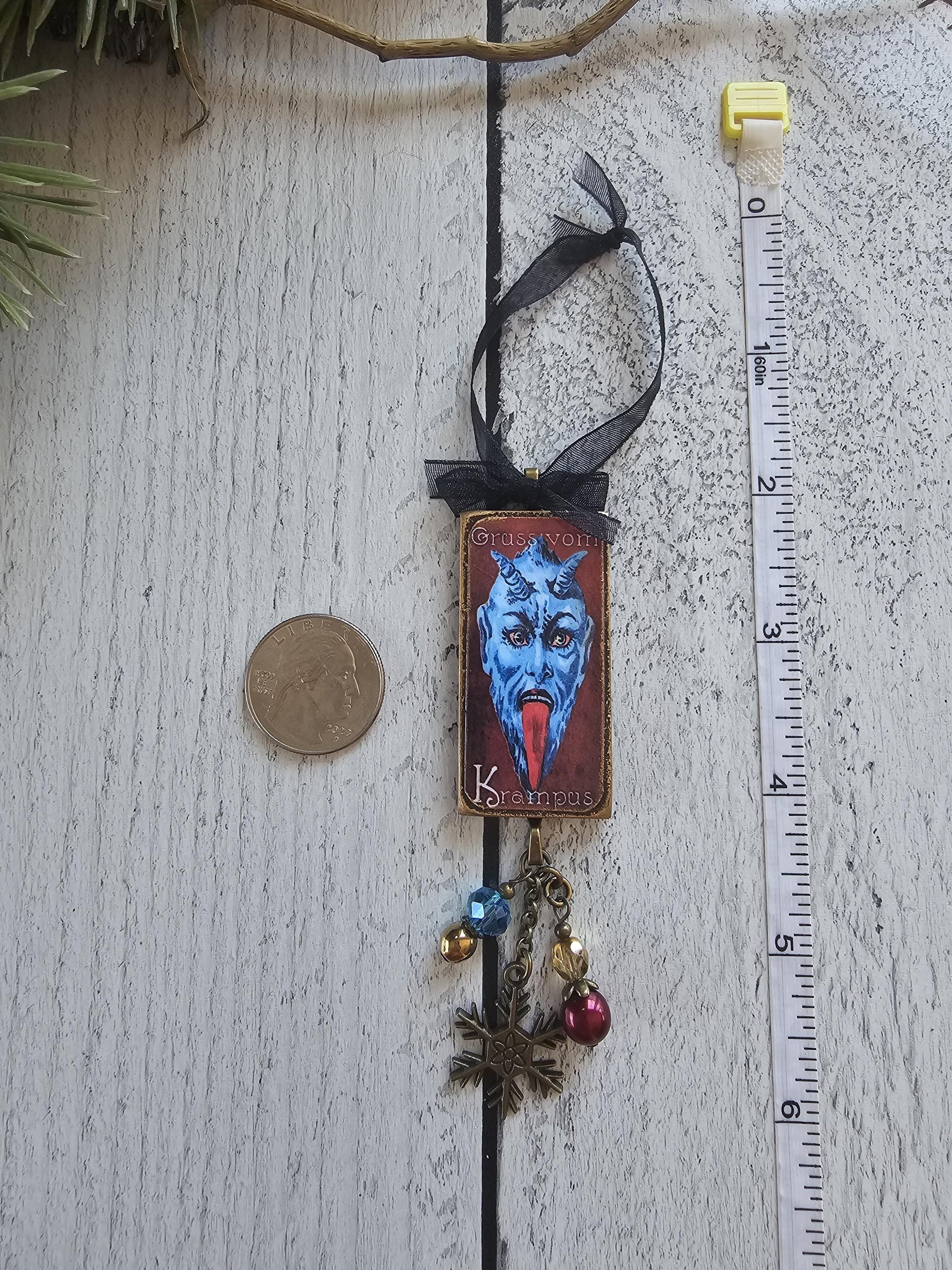 These handmade pendants feature vintage Krampus images. I've accented with glass bead dangle charms in gold, blue, green and red, and sheer black ribbon. You can also choose a snowflake charm or jingle bell charm. The ornaments feature a glossy finish. These make great gifts for the holiday season! Purchase one, or all three!