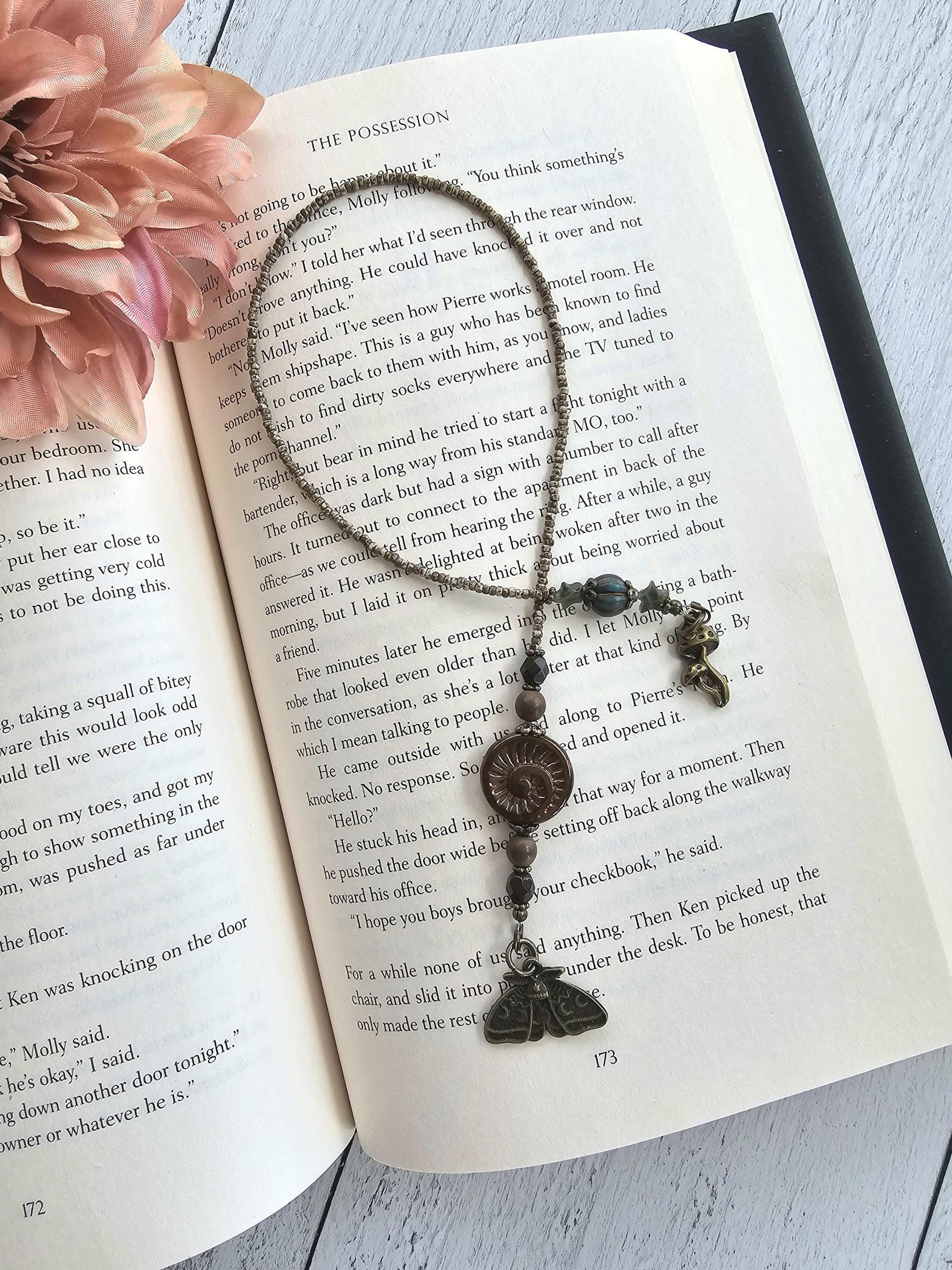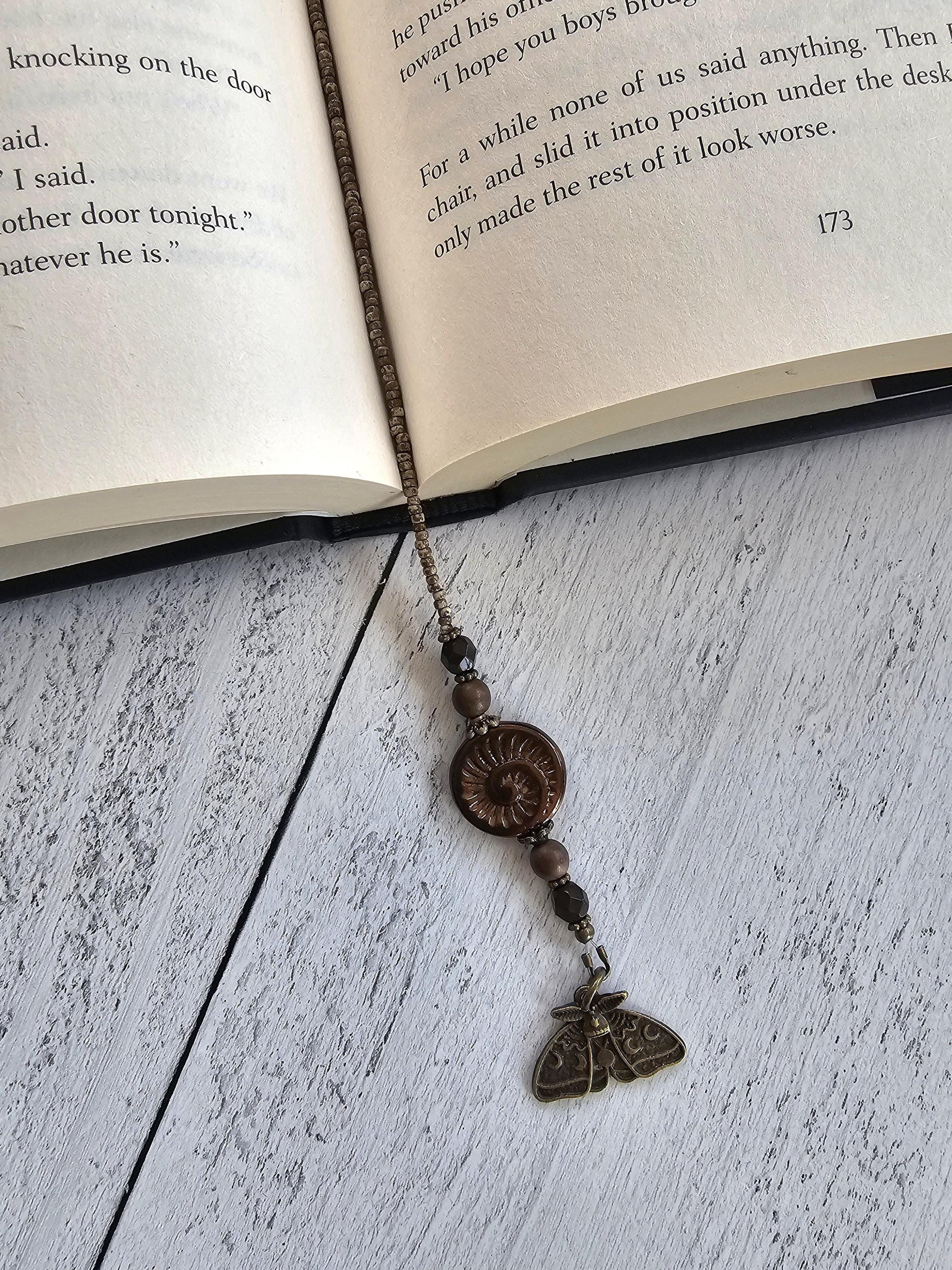 This luna moth beaded bookmark is a delightful accessory for bookworms and nature enthusiasts alike. Adorned with bronze plated charms, including a luna moth and a charming mushroom grouping, this bookmark captures the whimsical beauty of the forest. I've accepted with green aventurine star beads and a unique focal ammonite Czech glass bead. Whether you're diving into a thrilling novel or studying in the library, this magical bookmark will keep your page secure and add a touch of natural elegance to your reading experience. Treat yourself or surprise a fellow book lover with this lovely luna moth beaded bookmark.