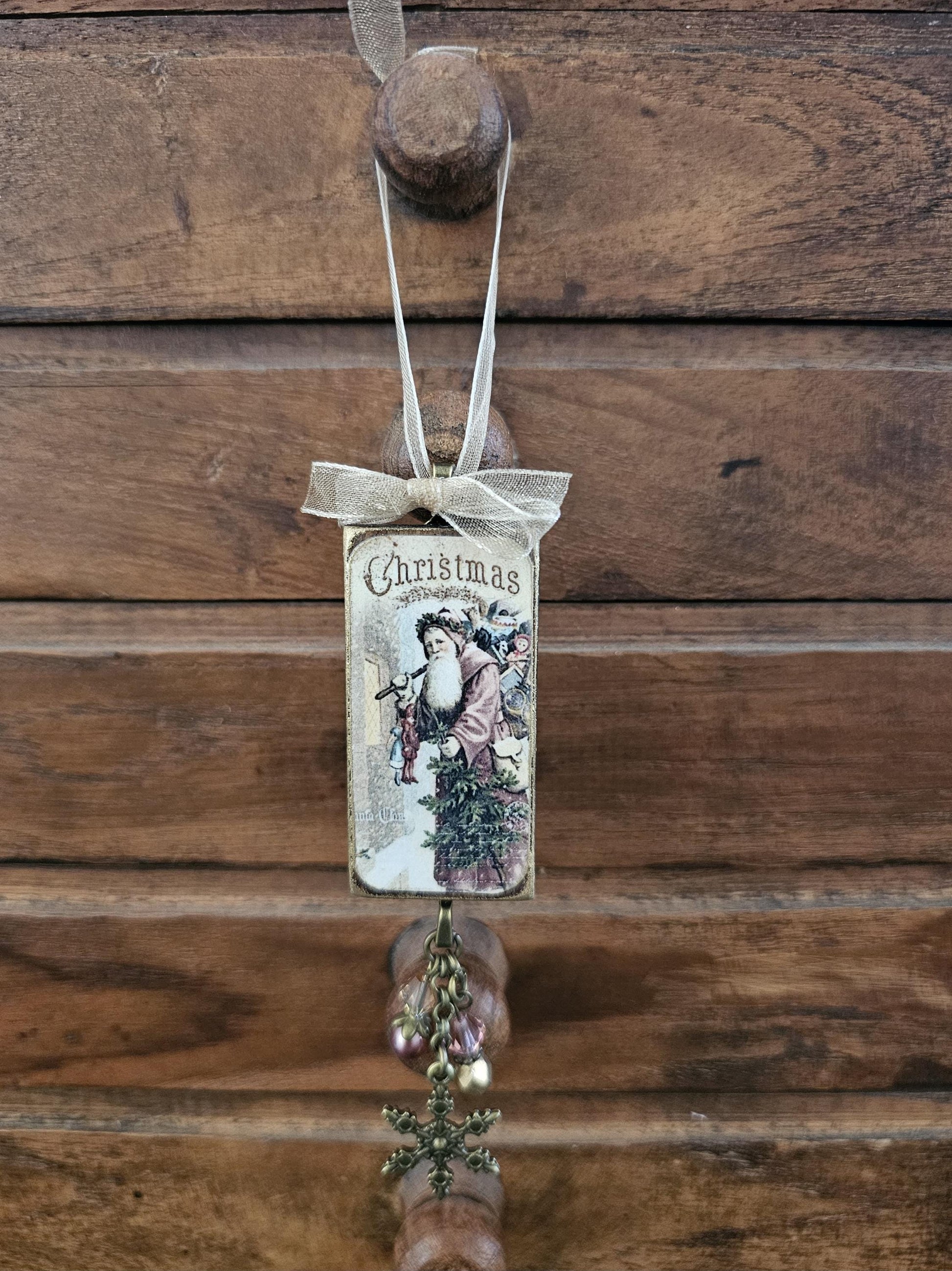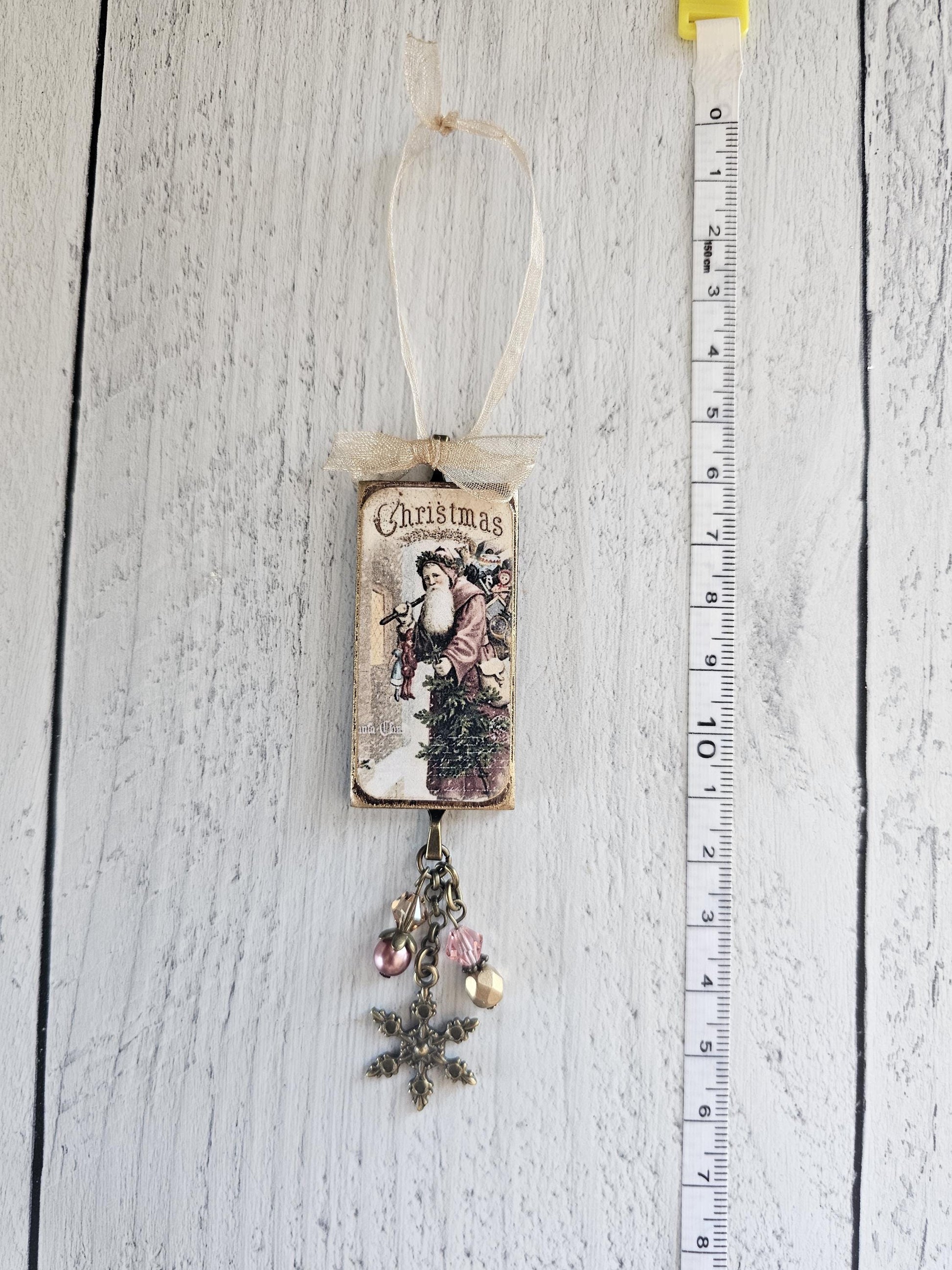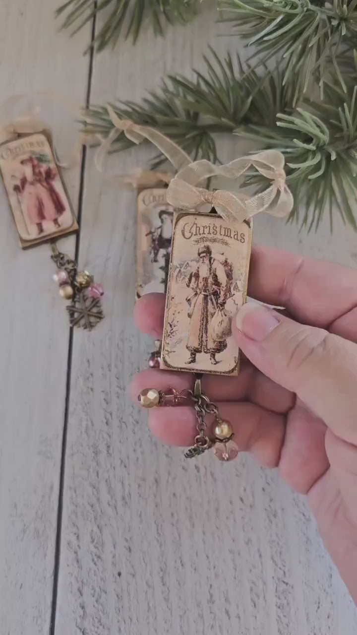 These handmade pendants feature reproductions of old Christmas card pictures of various Santa Claus figures. I've accented with glass bead dangle charms in pink and gold, snowflake charms and sheer gold ribbon. The ornaments feature a glossy finish. These make great gifts for the holiday season! Purchase one, or all three!