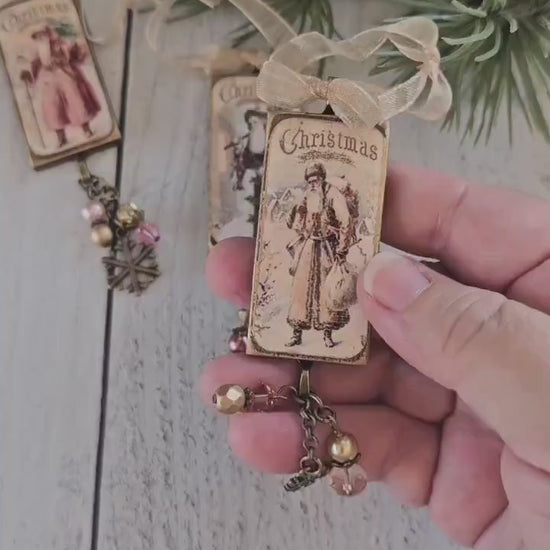 This listing features 3 unique vintage style rustic Christmas ornaments that I've created from my printer, and wood pieces that are essentially domino size. They are picture pendants, with antiqued bronze plated accents. The pendants are glued, sanded, gilded, and sealed several times with two different processes by me. They are light weight, lighter than my previous glass ornaments, but didn't let that fool you. You can expect the same great quality you've come to expect with my products.