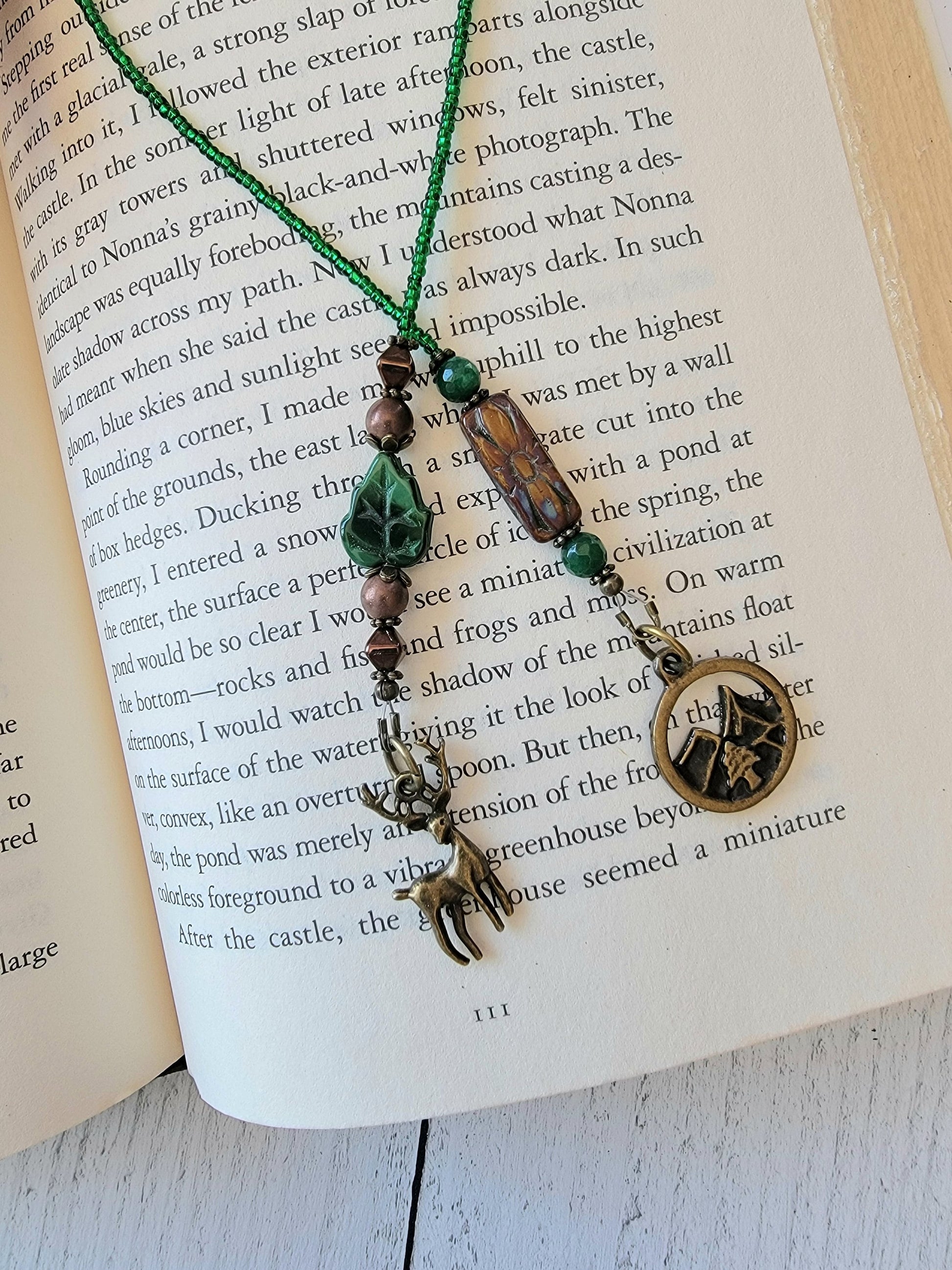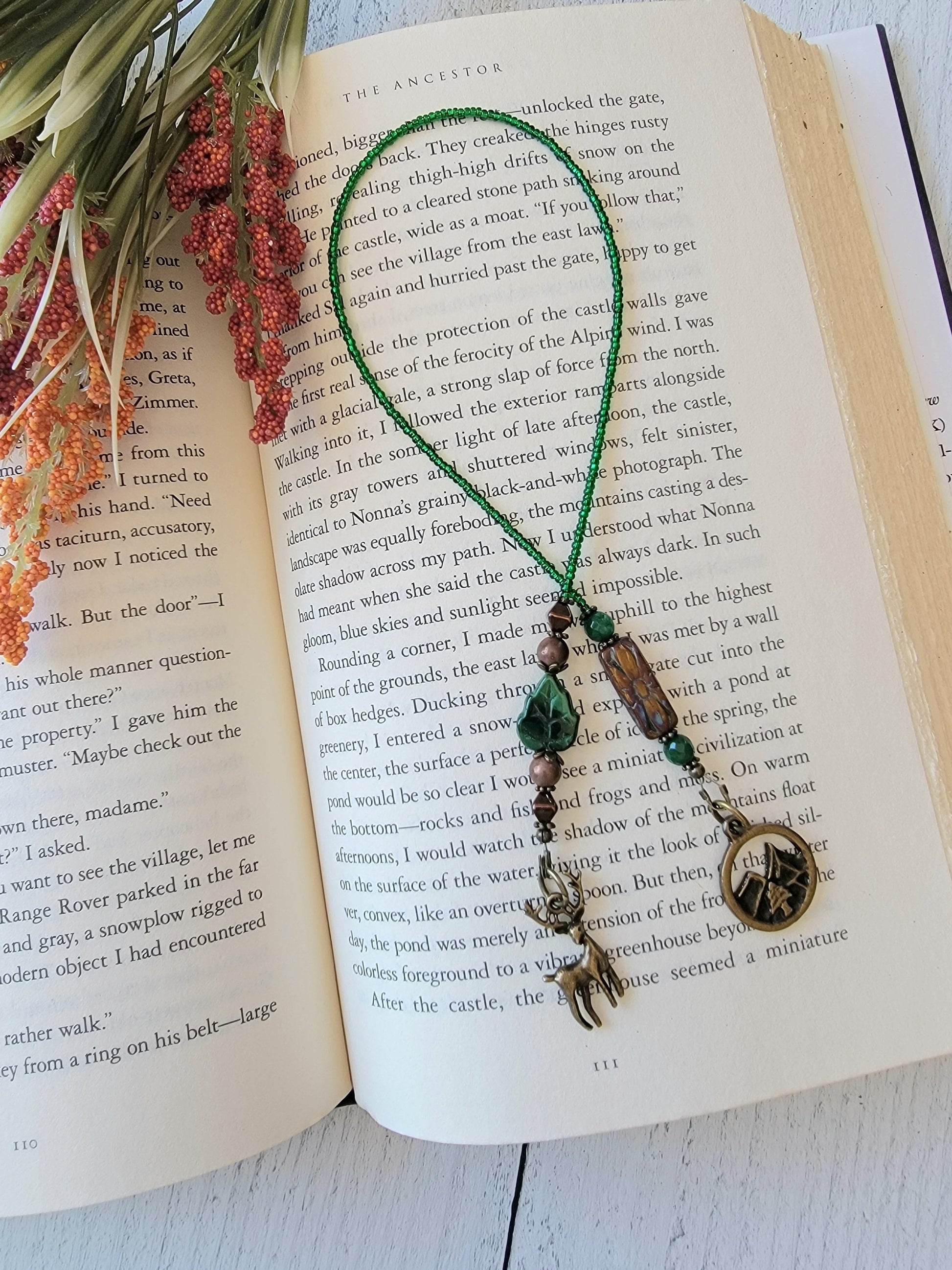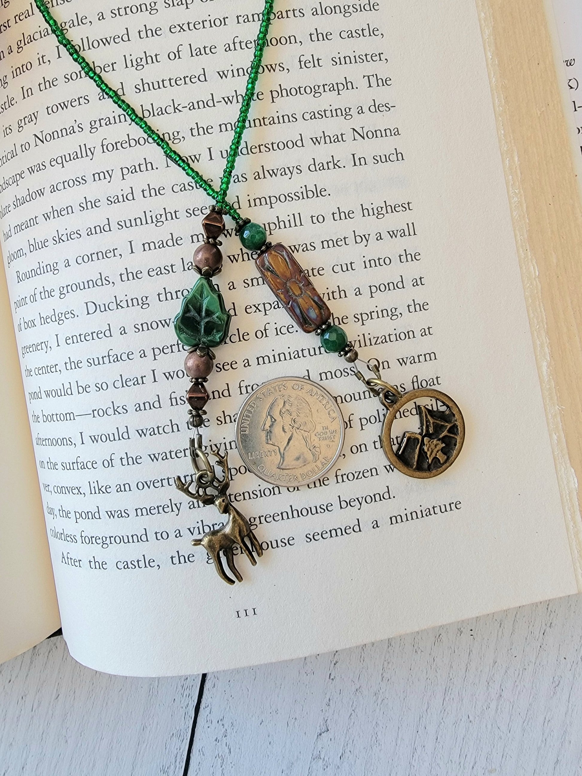 Rustic Chic Beaded Bookmark with Bronze Stag, Mountain Charms
