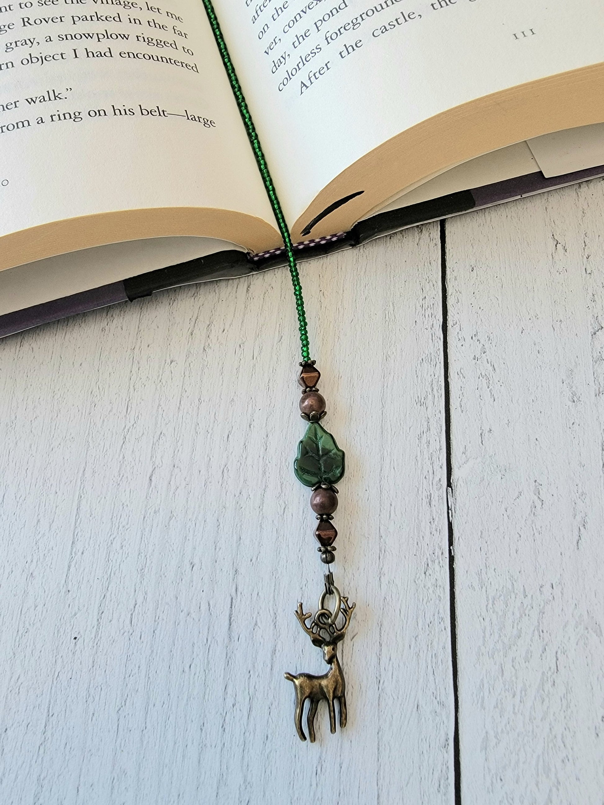This strung beaded bookmark features a majestic bronze stag and mountain charms, accompanied by a beautifully green glass leaf bead. This handmade bookmark is the perfect accessory for any book lover. The bronze stag symbolizes strength and grace, while the mountain charms evoke a sense of adventure and exploration. With its eye-catching combination of colors and textures, this bookmark not only marks your reading progress but adds a touch of elegance to any book. Treat yourself or gift it to someone special who appreciates the beauty of nature and the joy of reading.