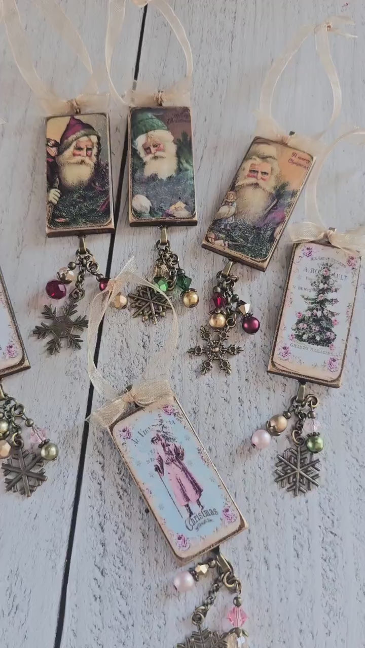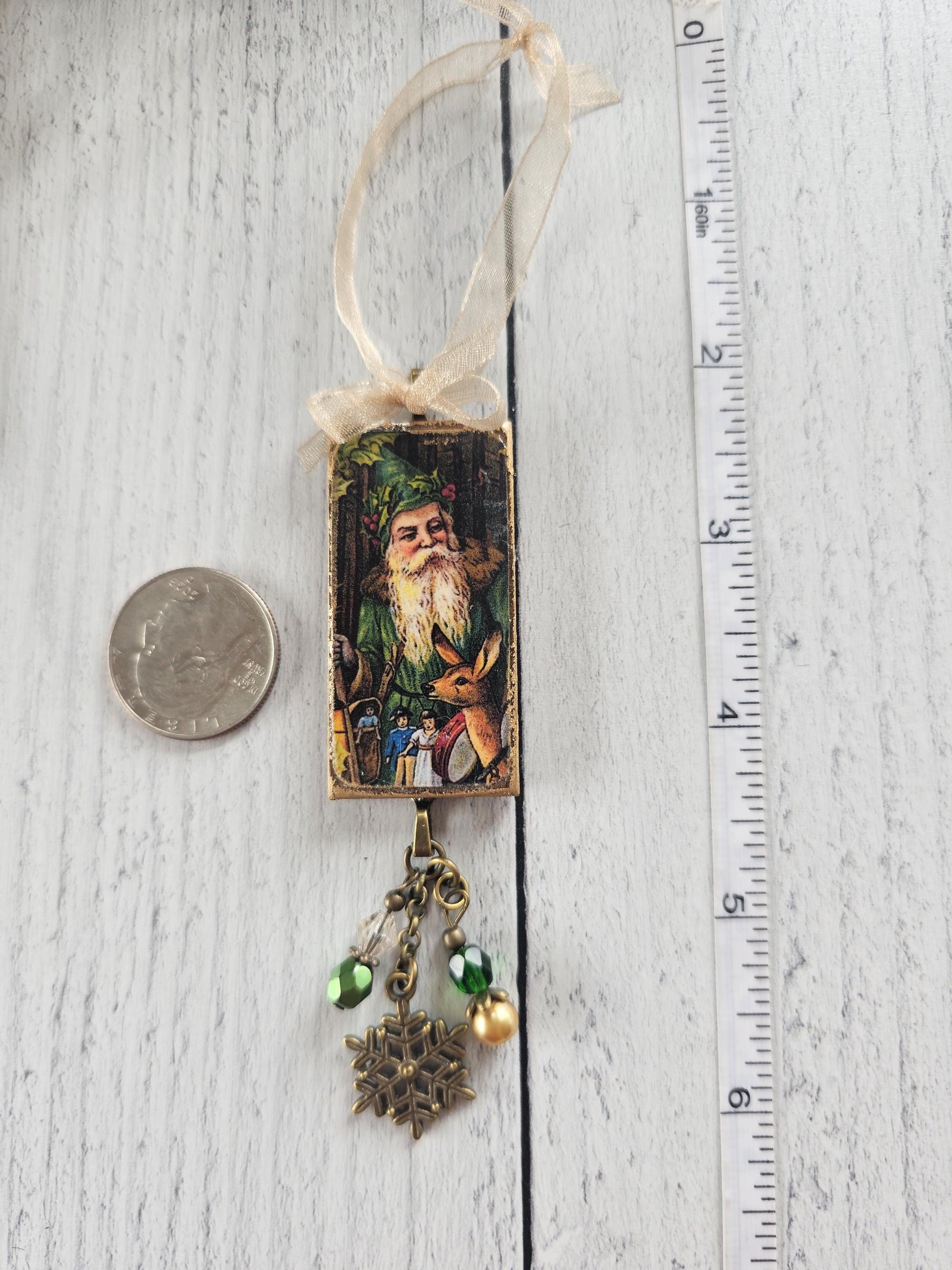These handmade pendants feature reproductions of old Christmas card pictures of various Santa Claus and other figures. I've accented with glass bead dangle charms in gold, blue, green and red, snowflake charms and sheer gold ribbon. The ornaments feature a glossy finish. These make great gifts for the holiday season! Purchase one, or all three!