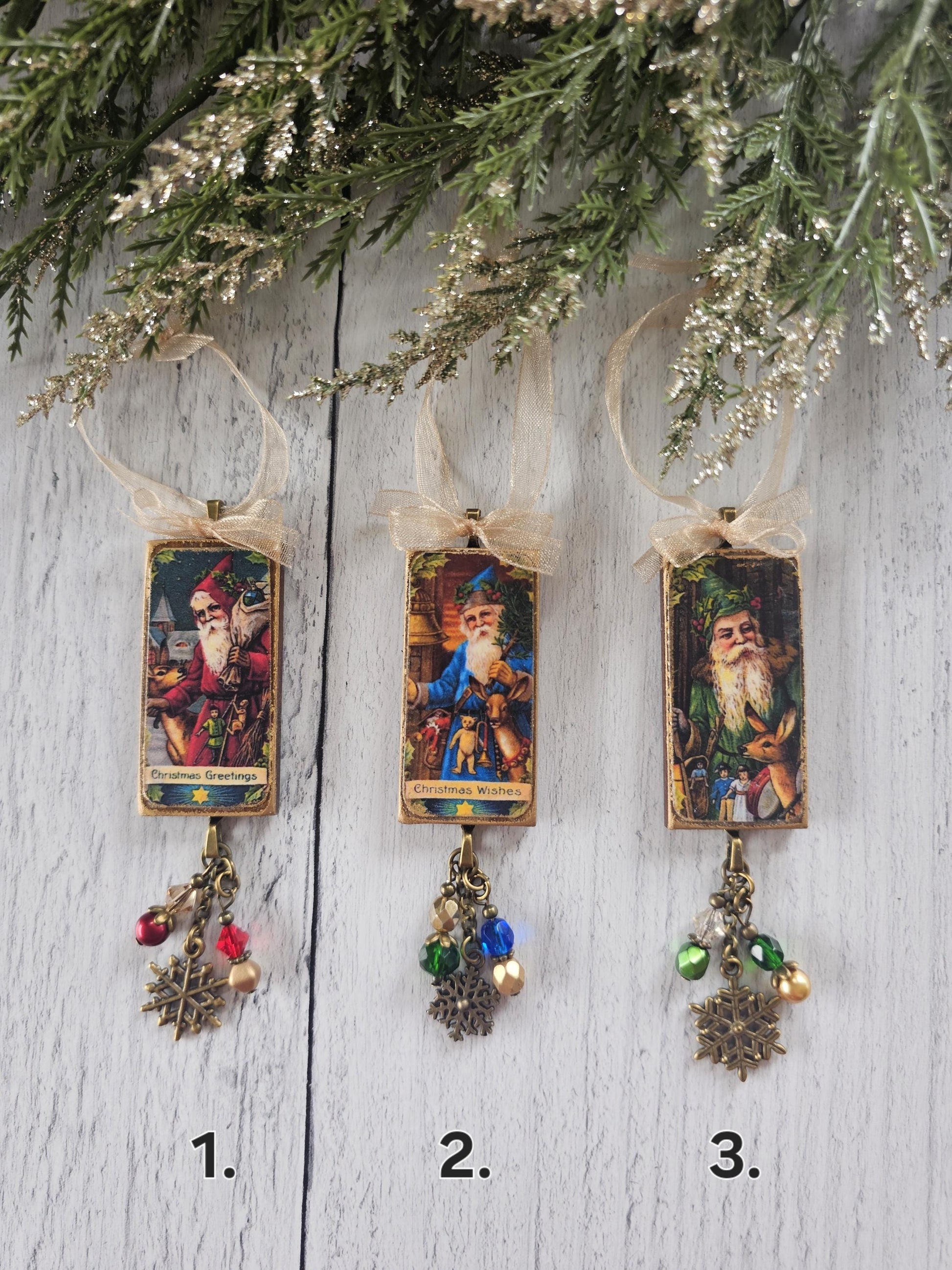 Set of Three Handmade Christmas Ornaments Featuring Woodland Vintage Santa, Buy One or All Three