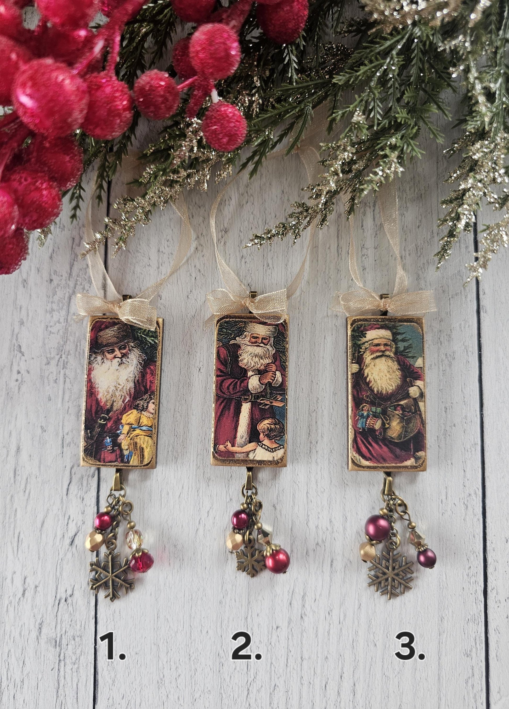 These handmade pendants feature reproductions of old Christmas card pictures of various Santa Claus and other figures. I've accented with glass bead dangle charms in gold and red, snowflake charms and sheer gold ribbon. The ornaments feature a glossy finish. These make great gifts for the holiday season! Purchase one, or all three!