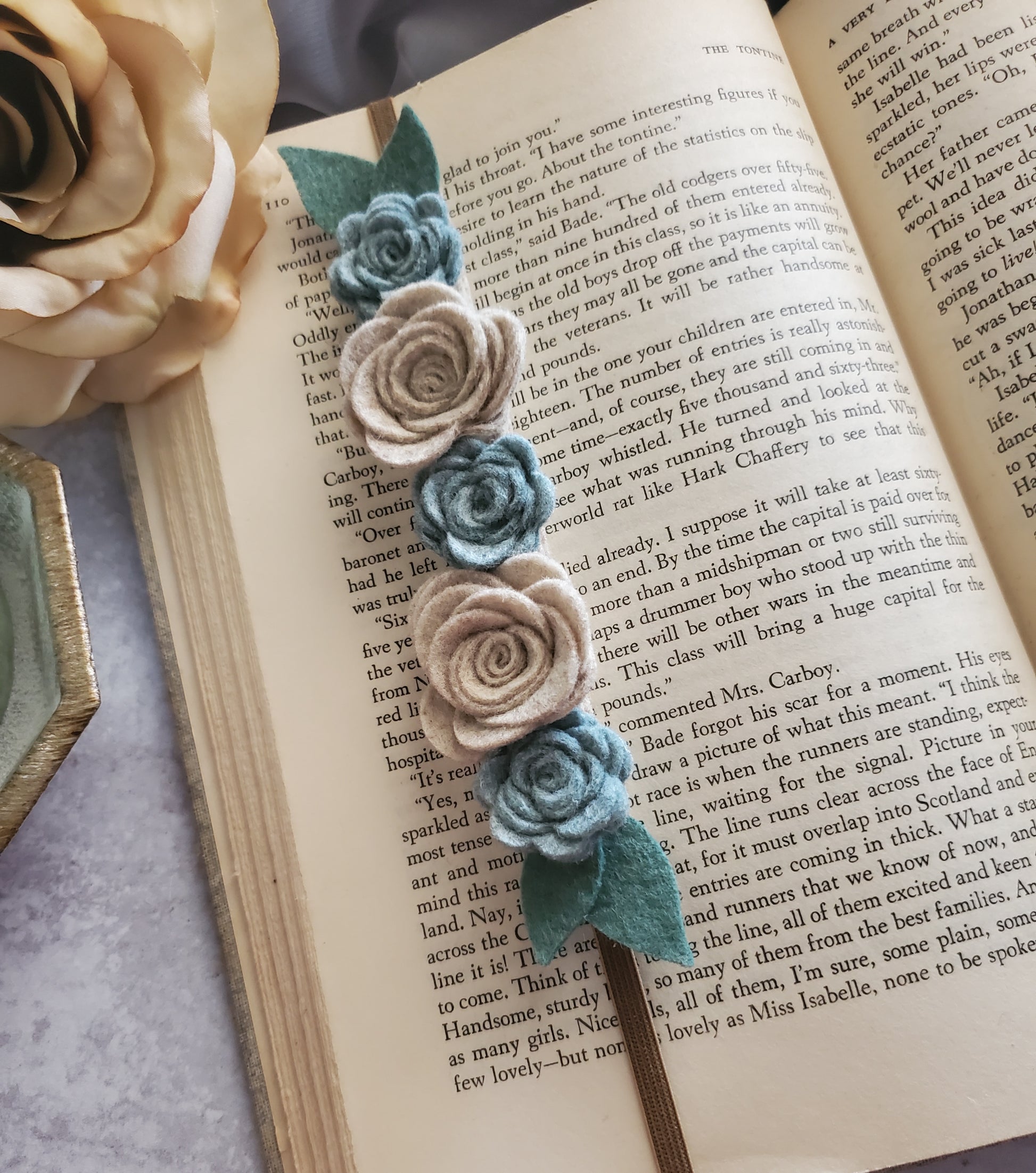 This bookmark has five merino blend felt flowers in blue and beige on a light brown soft skinny elastic. It wraps around the book cover and any number of pages you require. A great way to display and accessorize your books, and hold your spot! This is sized for most popular hardback books, generally 8-11 inches.